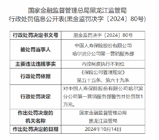 10月21日金融一线音书,国度金融监督解决总局黑龙江监管局行政处罚信息公开表裸露,中国东说念主寿保障股份有限公司哈尔滨分公司第一营销做事部因内适度度实验不到位被警告并罚金1万元。